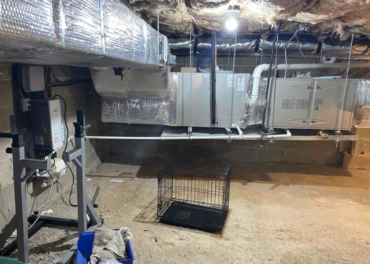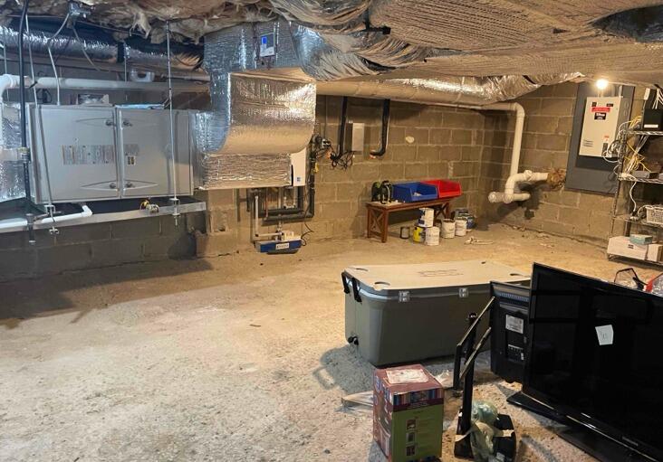 Before: The Newtown estate faced significant radon exposure of 9 pCi/L, complicated by unsealed sump pumps and furniture obstructing potential mitigation areas.