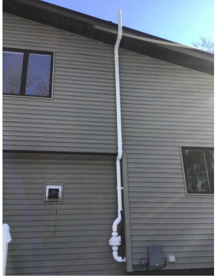 We designed and installed a radon mitigation system that worked with the home’s existing conditions. The piping was routed in the same corner and exited to the right toward the outdoor stairs, avoiding the electrical service area. The fan was mounted on the gable wall next to the service, staying on the same plane for a clean exterior appearance.