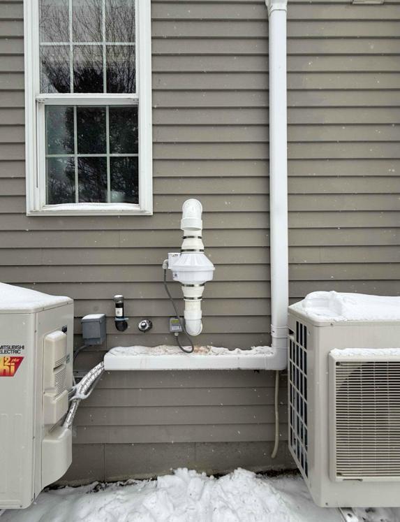 We installed the radon mitigation system in front of the oil tank fills behind the chimney, carefully routing the piping around the heat pump lines while keeping the installation clean and efficient. The existing stub-out was properly capped, and the small hole in the foundation was sealed with spray foam to ensure the system maintained proper airflow and integrity.
