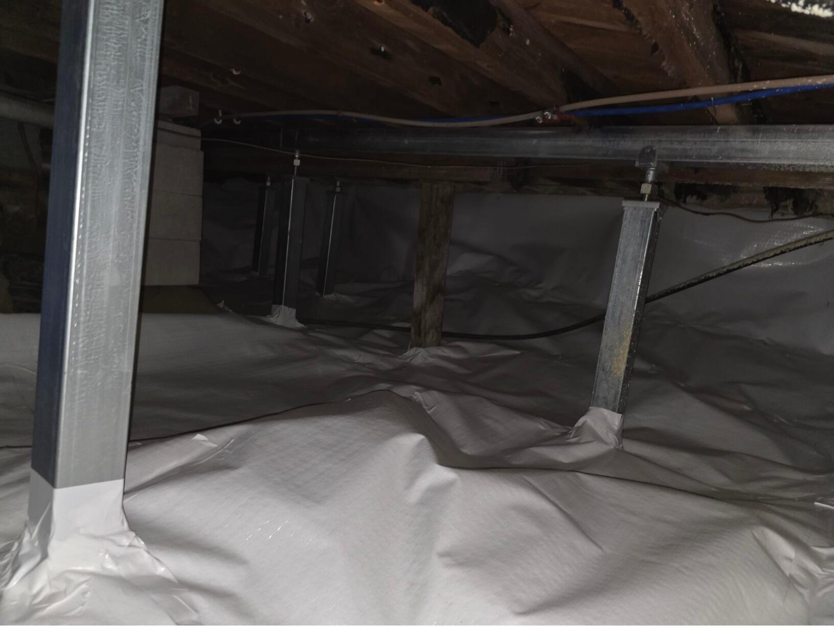 In Dunbarton, NH, we encountered a crawl space in need of serious attention. The aging wooden supports in the homeowner’s area were compromised due to moisture and high humidity, as visible in the before photo. We installed our SmartJack System to stabilize and lift the structure, laying the proper foundation with our steel bases and adjustable top brackets. The addition of CleanSpace Drainage Matting provided effective moisture control, and the CleanSpace system encapsulated the space for a clean, dry environment. The transformation successfully ensured a secure, lasting solution.