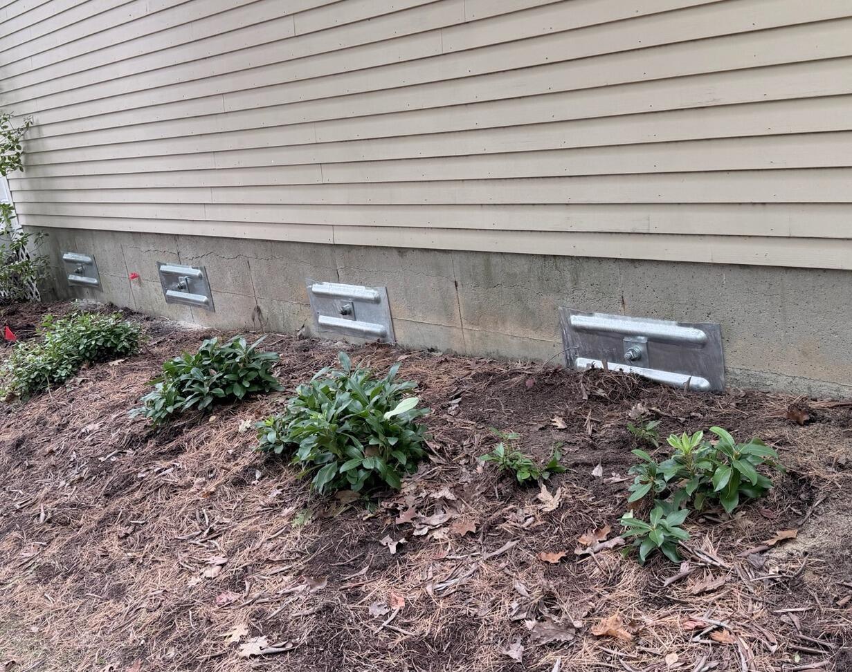 A home in Bedford, New Hampshire, had a foundation wall that was bowing inward. The homeowners called EFS for a free inspection of their home. Our Design Specialist recommended installing Geolocks onto the foundation wall. Our team installed 6 Geolocks on the foundation wall to straighten the foundation wall and stabilize it.