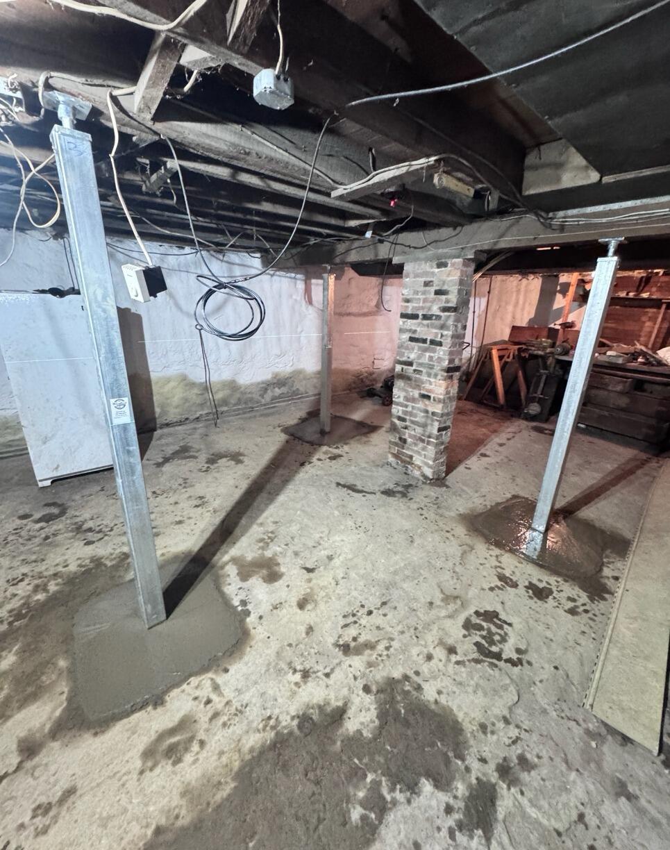 In Boonville, NY, a homeowner noticed sagging basement support beams. As the before photo shows, this presented a serious concern for the structural integrity of their home. To address this, we implemented our SmartJack System. As the after photo demonstrates, the SmartJack system effectively stabilizes crawl space beams, restoring the floor to its original level and eliminating unwanted bounce in the floors above. Our proven solution ensures a sturdy support foundation, leveraging engineered fill for even distribution of weight, as well as galvanized steel components for long-term durability.