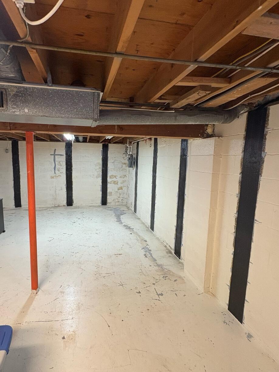 In Jamesville, NY, a homeowner contacted us to address foundation issues before refinishing their basement. In the before photo, it's clear that the foundation was compromised, risking further damage over time. Our team installed the CarbonArmor system to provide a long-lasting solution. Using carbon fiber-reinforced polymers, CarbonArmor effectively stabilized the foundation. Notice in the after photo how the straps, combined with our advanced epoxy adhesive and ArmorLock brackets, halted any further movement, ensuring the foundation's integrity remains intact for years to come.
