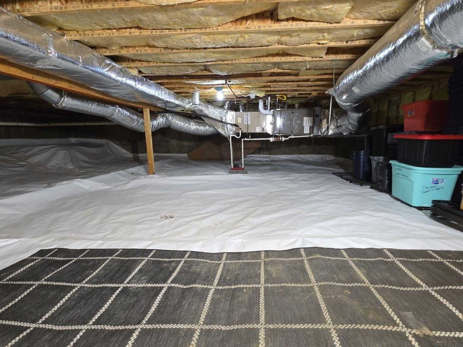 North Point Radon encapsulated this crawlspace and installed a radon mitigation system. Encapsulating the crawlspace creates a sealed barrier between the soil and the home while still allowing the radon mitigation system to vent the gas from under vapor barrier to the exterior.