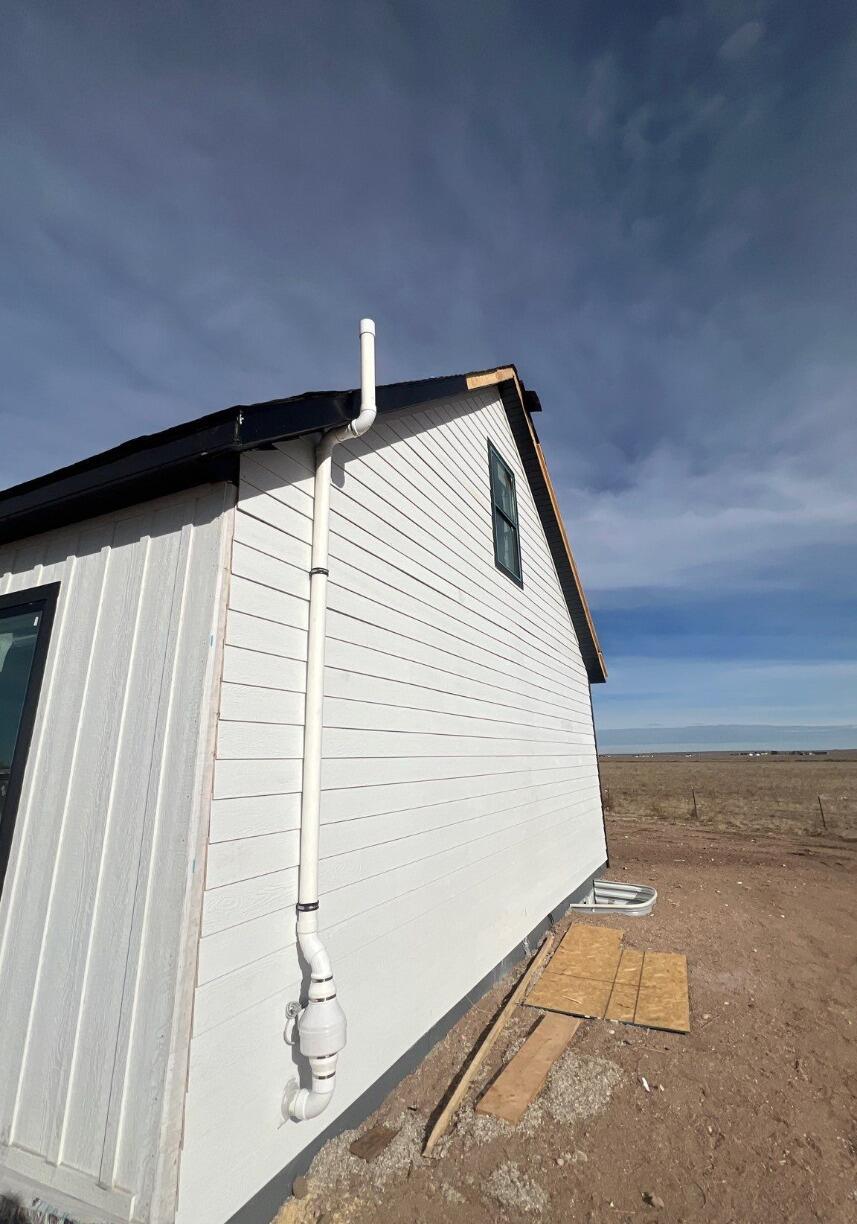 Exterior radon mitigation system installed on this home in Cheyenne, Wy. The radon vent pipe routed up the exterior wall and extended above the roof line for proper Radon gas dispersion.